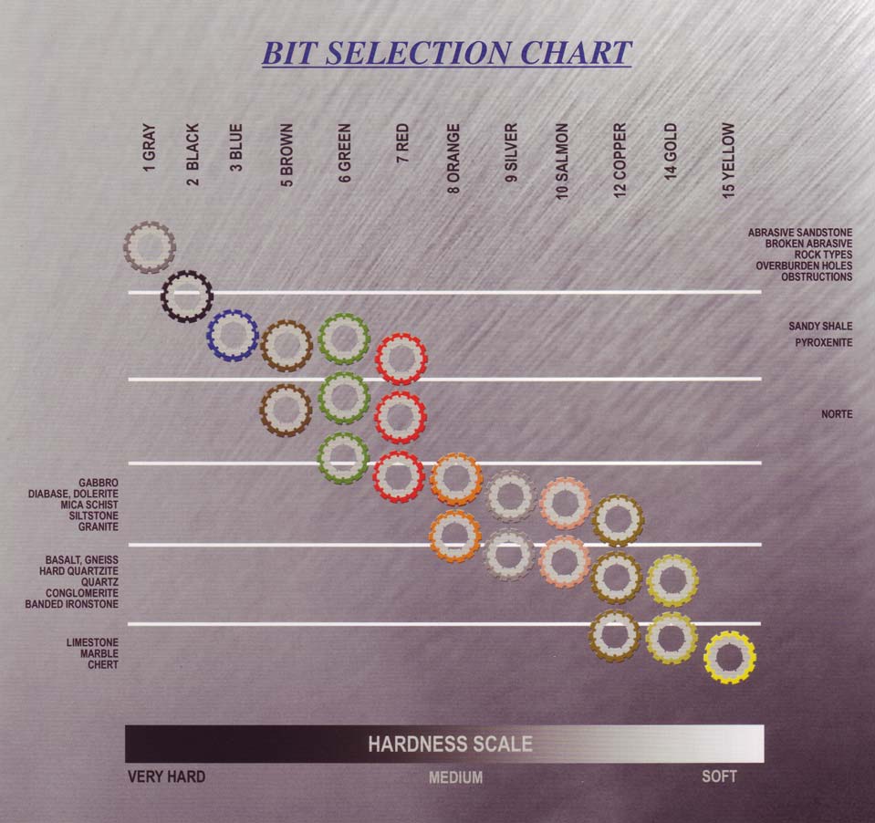 furnacing technology is the secret to the long life of the bit. The matrices are defined by numbers for hardness ranging from 1—15, with 1 representing the hardest matrix and 15 the softest. All matrices are colour coded as shown in the chart below.