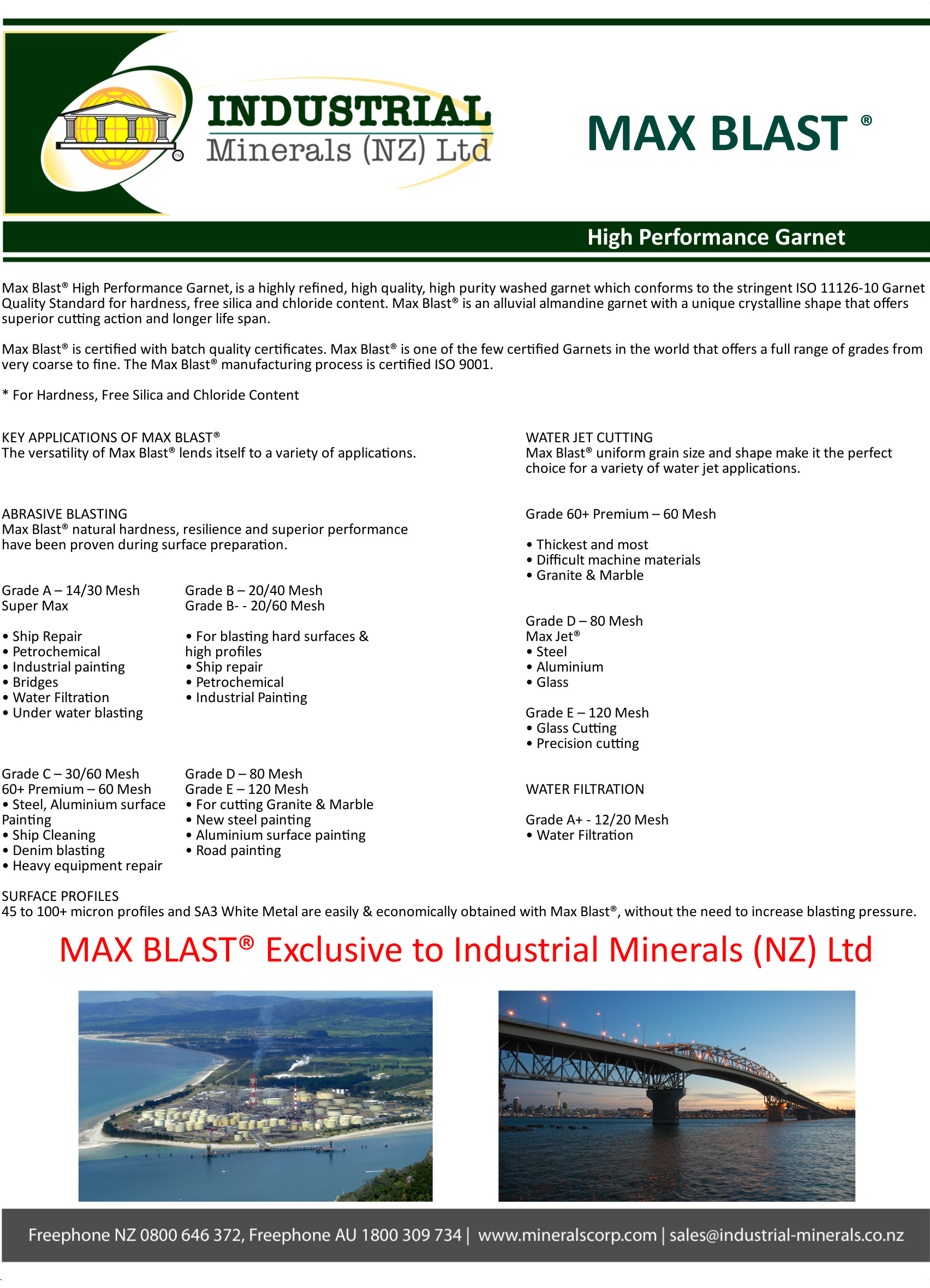 Max Blast® High Performance Garnet, is a highly refined, high quality, high purity washed garnet which conforms to the stringent ISO 11126-10 Garnet Quality Standard for hardness, free silica and chloride content. Max Blast® is an alluvial almandine garnet with a unique crystalline shape that offers superior cutting action and longer life span. Max Blast® is a Registered Trademark of Industrial Minerals (NZ) Ltd in Australia & New Zealand.