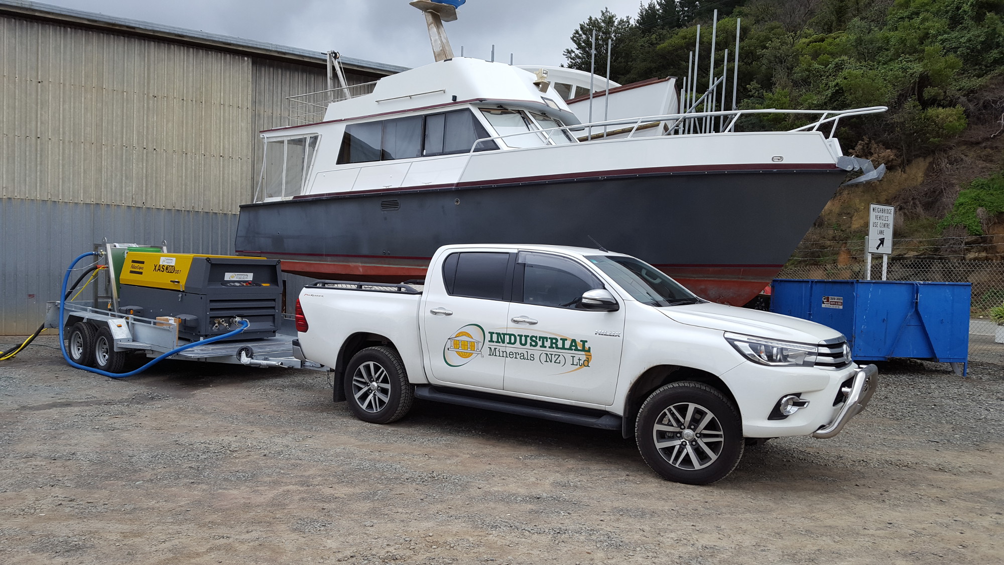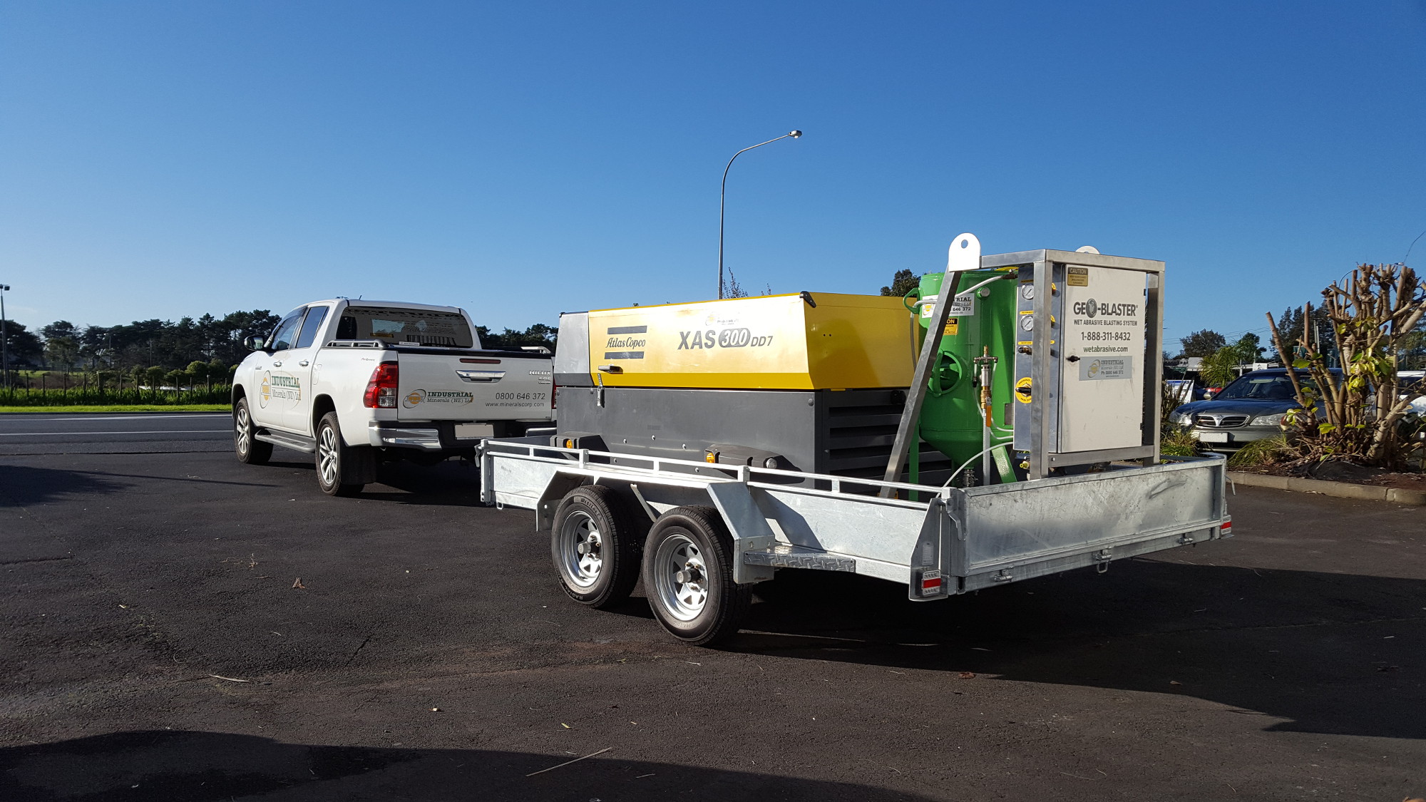 Industrial Minerals can build a trailer or truck mounted wet/vapor blasting setup to suit your individual requirements including the all new Ecoquip 2 Vapor Blaster. All trailer setups are individually weighted to ensure safe towbar weights are followed, making them a safe & easy tow. For maximum efficiency we use the manufacturers reccomendation of a 300+CFM compressor to allow the use of larger blast nozzles and higher blast pressures. These offer greater productivity and will out perform smaller sized compressor units. Contact us today with your request and we would be happy to make a reccomendation for your desired surface preparation requirements!